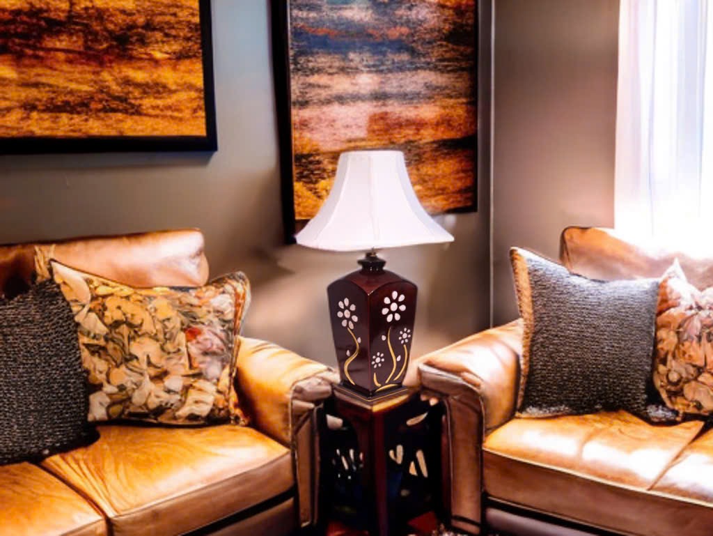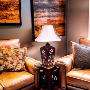 Chất liệu: Gỗ,Đá Thạch Anh, hợp kim phun sơn tĩnh điện, đồng, chao vải cao cấp, đế bọc da.