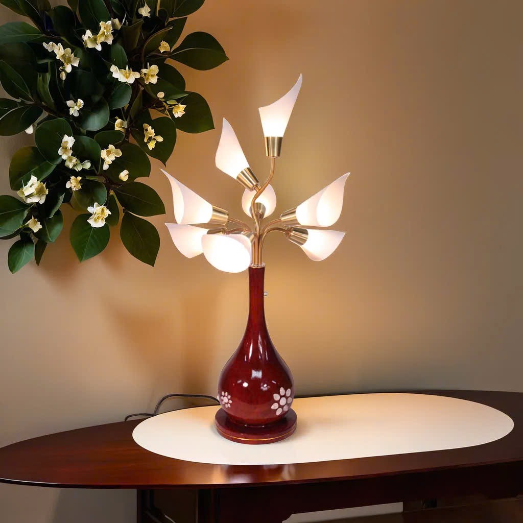 Chất liệu: Gỗ,Đá Thạch Anh, hợp kim phun sơn tĩnh điện, đồng, chao vải cao cấp, đế bọc da.