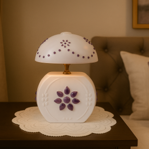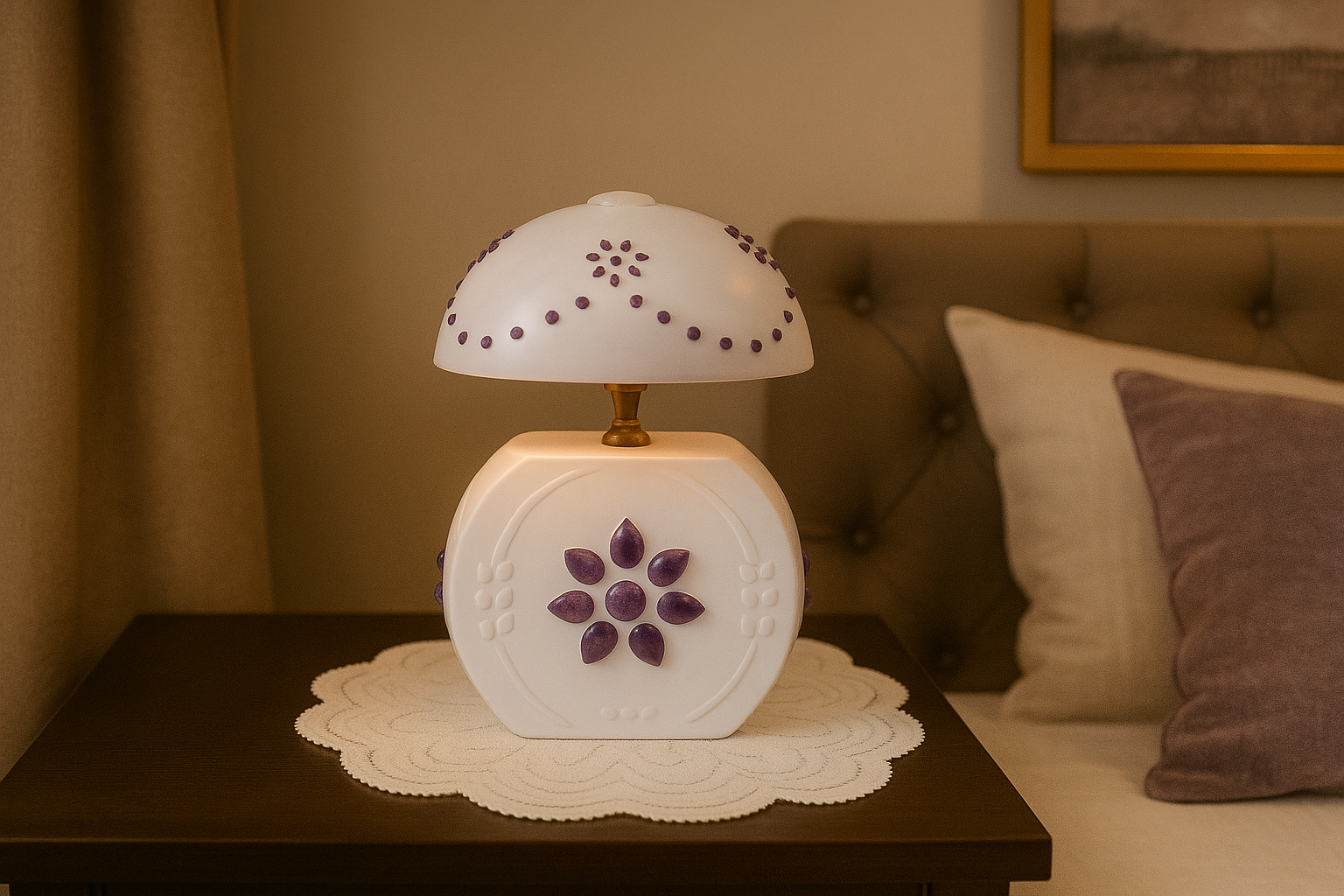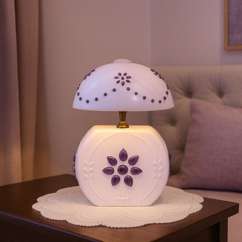 Chiếc đèn Limovic trong hình là một tác phẩm nghệ thuật thực thụ, kết hợp hài hòa giữa thiết kế hiện đại và yếu tố thủ công tinh xảo. Phần thân và chụp đèn được chế tác từ chất liệu trắng ngọc mịn màng, nổi bật với các họa tiết khảm đá thạch anh tím tự nhiên – loại đá không chỉ mang vẻ đẹp lấp lánh mà còn được tin là mang năng lượng tích cực, giúp thanh lọc không gian và thu hút may mắn, tài lộc.