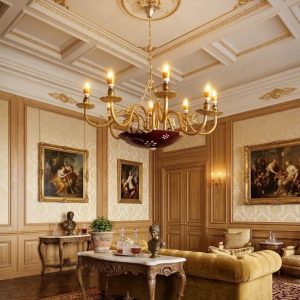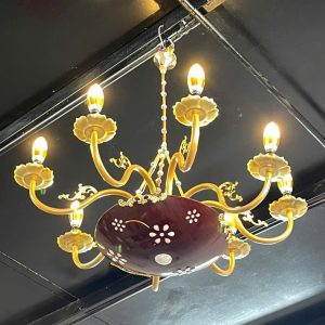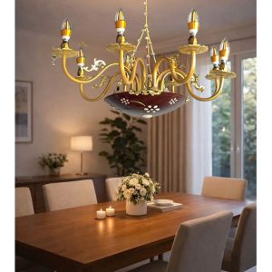 Đèn chùm phong cách cổ điển này có thiết kế tinh xảo với gỗ khảm đá thạch anh trắng tạo nên sự sang trọng, quyền quý. Những đường cong thanh lịch của tay đèn chùm và các yếu tố lấy cảm hứng từ phong cách cổ điển được được làm hoàn toàn từ đồng nguyên chất khiến nó trở thành sự bổ sung hoàn hảo cho bất kỳ không gian theo chủ đề truyền thống hoặc cổ điển nào. Ánh sáng dịu nhẹ, ấm áp do đèn chùm cung cấp làm tăng thêm bầu không khí, mang đến sự thanh lịch vượt thời gian cho căn phòng.